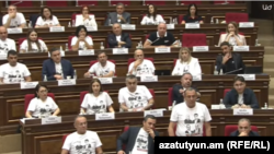 «Հայաստան» դաշինքի պատգամավորներն Ազգային ժողով են եկել «քաղբանտարկյալ» գրությամբ սպիտակ շապիկներով։