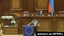 «Հանուն հանրապետության» կուսակցության նախագահ Արման Բաբաջանյանն էլ խորհրդարանի ամբիոնից կախեց ԵՄ դրոշը։