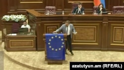 «Դուք Հայաստանի Հանրապետության Ազգային ժողովի ամբիոնից հիմա կախել եք Եվրամիության դրոշը, ինչը խնդիր չէ, բայց Հայաստանի Հանրապետության Ազգային ժողովում Հայաստանի Հանրապետության դրոշը պետք է լինի», - ասաց Եղոյանը: